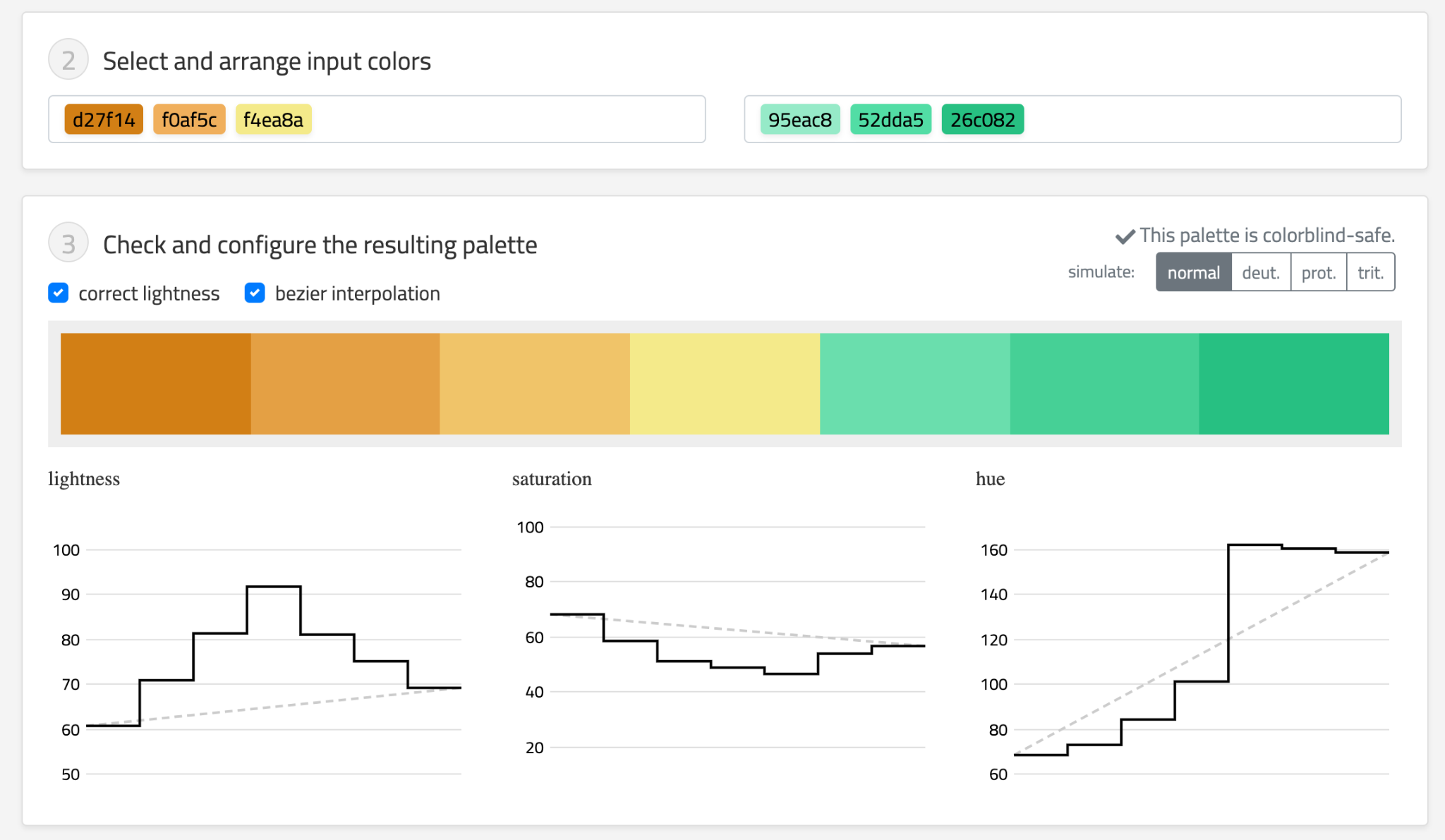 It was also important to maintain colour-blind accessibility as much as possible, so we tested our gradients using tools to evaluate how colour-blind-friendly they are. We used the chroma.js colour palette helper for this because it offers a lot of information about contrast and accessibility of colour palettes or gradients. To create a palette that is accessible to all three types of colour-blindness, it is important to vary the lightness – and, often, saturation – of the colours just as much as the hue. That way, the colours are still distinguishable by their lightness regardless of which hues appear the same to someone.